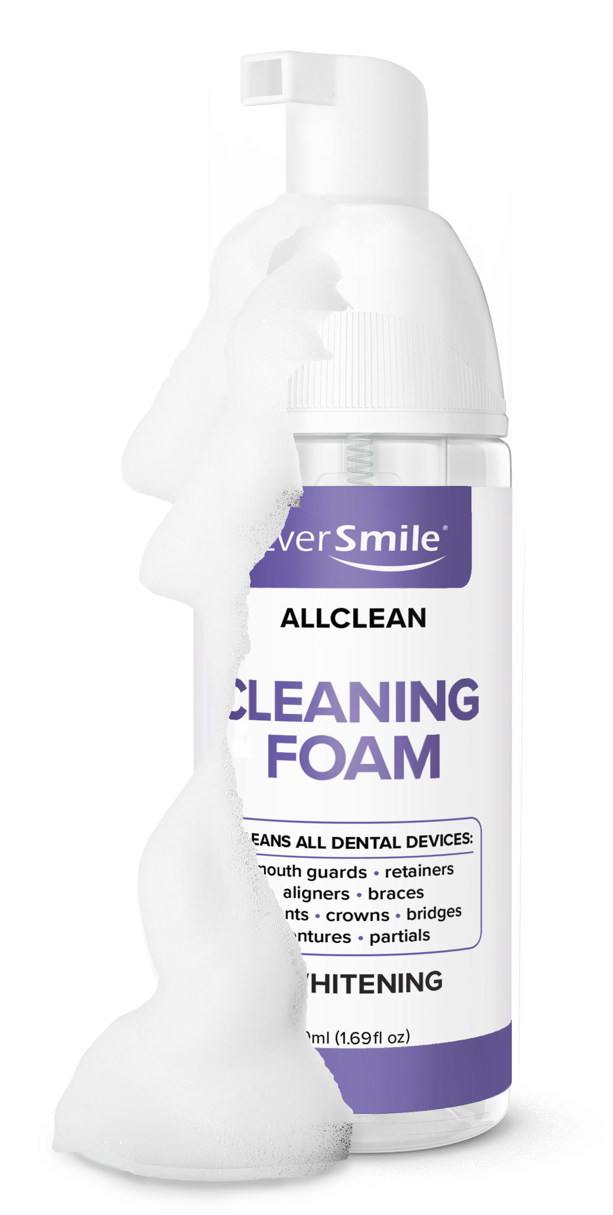 AllClean Foam is safe, easy to use, and made with highly effective ingredients that make oral hygiene a breeze. It's a multipurpose cleaning foam that can be used on a variety of dental devices such as aligners, retainers, implants, dentures, and all mouth guards. The ALL-IN-ONE foam removes stains, kills bacteria, freshens breath, and whitens teeth up to 3-4 shades in 4 weeks with virtually no sensitivity.